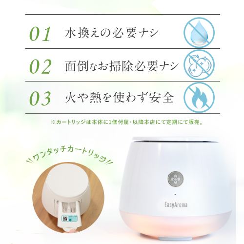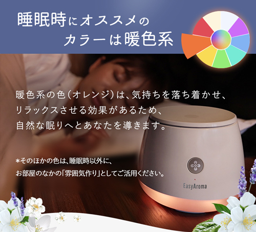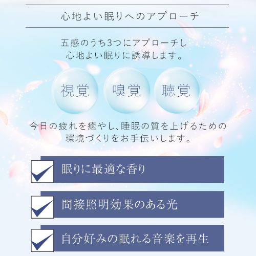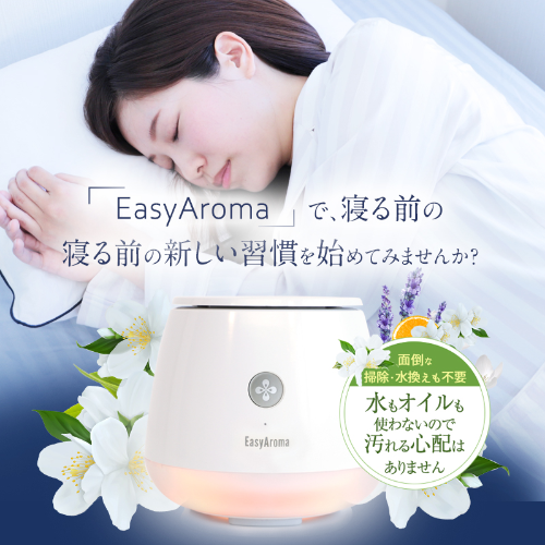 「嗅覚」 「視覚」「聴覚」の3つにアプローチし心地よい眠りに誘導。水もオイルも使わないから汚れない!新感覚アロマディフューザー