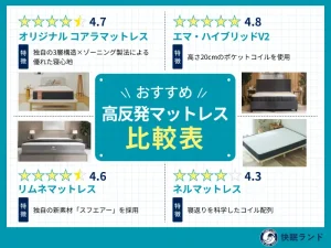 もし、紹介した対策を講じても低反発マットレスを使用することが合わない場合は、高反発マットレスを使用するほうがよいかもしれません。下記記事では、おすすめの高反発マットレスを紹介していますので、参考にされてください。