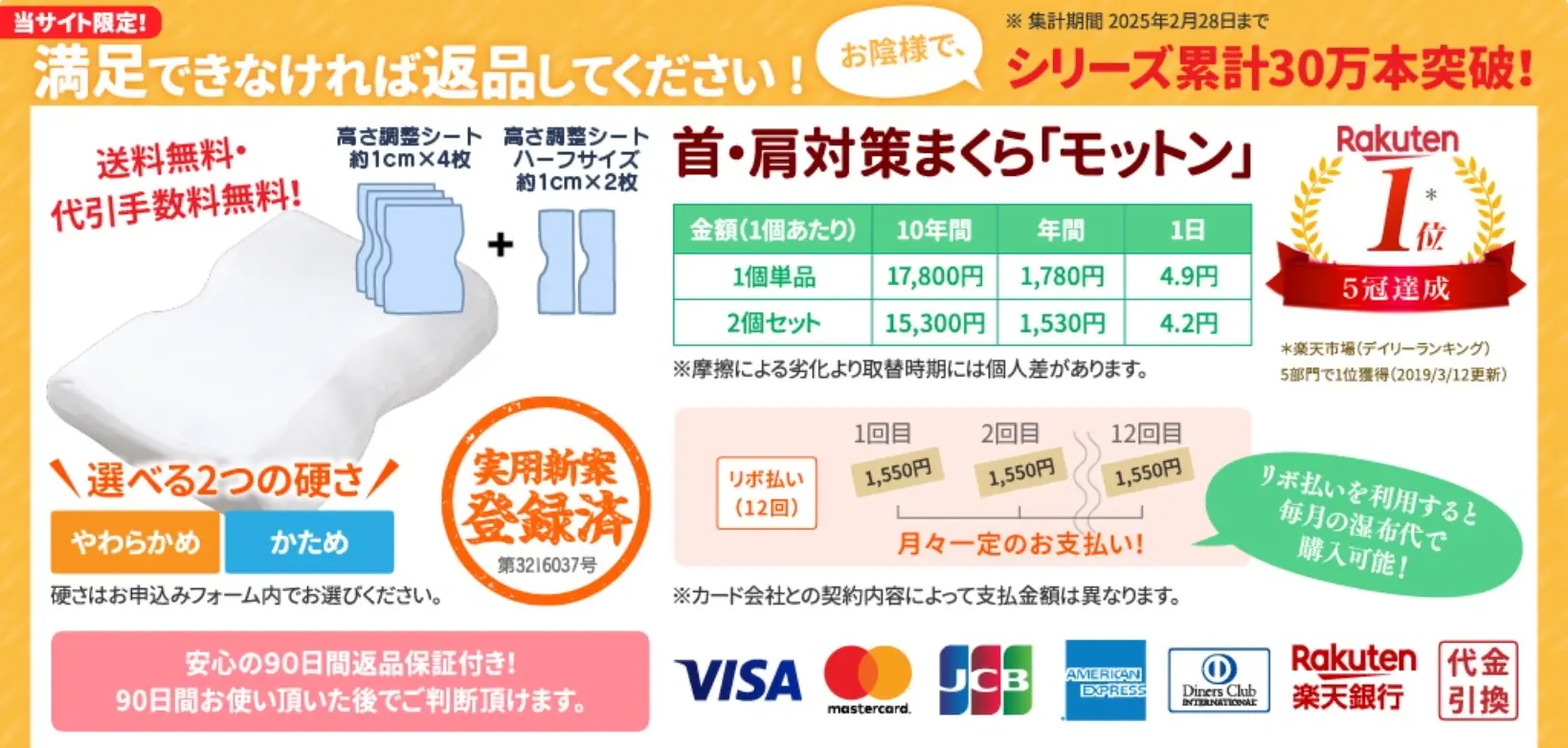 例えば、公式サイトでモットン枕の2個セットを選ぶと、1つあたりの代金が2,500円もお得になるケースがあります。