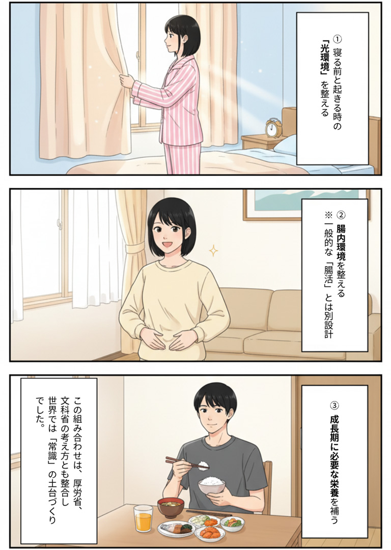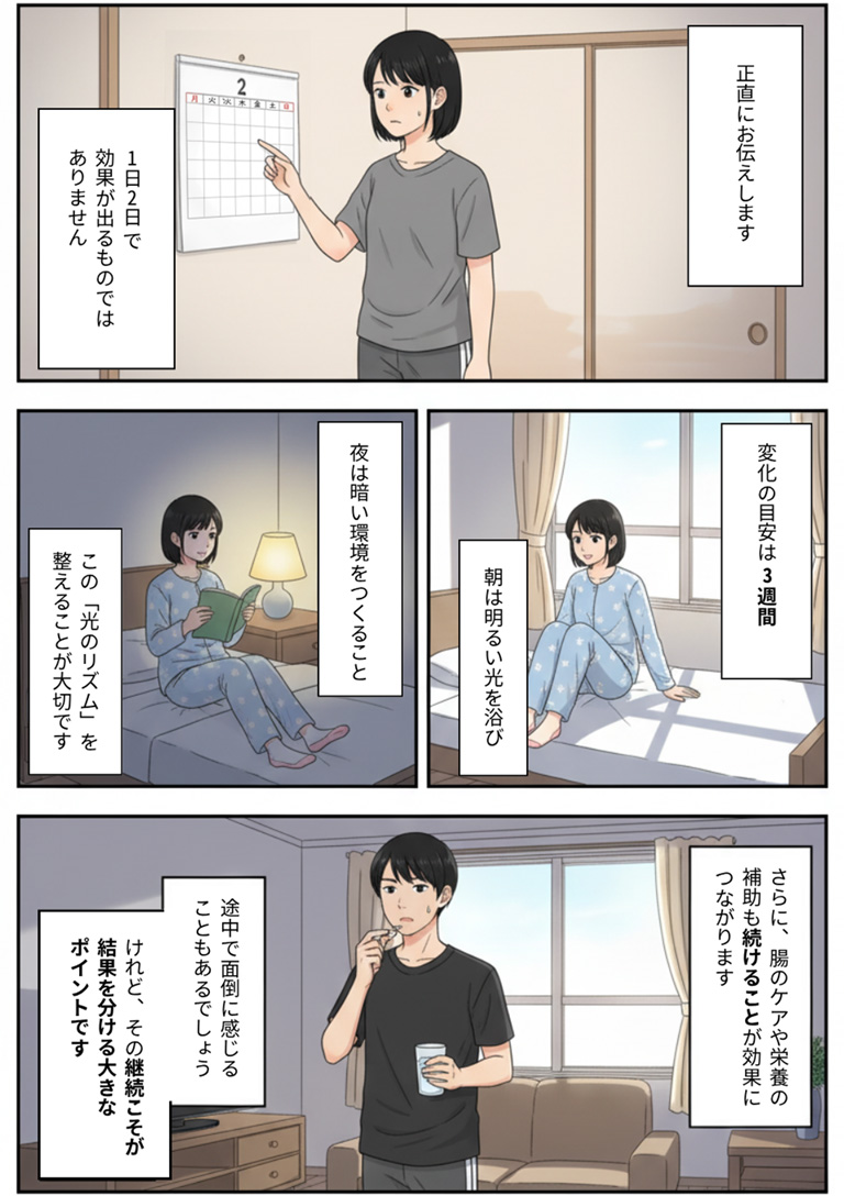 睡眠障害を患っていた時は、朝5時に寝て昼12時に起きる夜型生活だったが睡眠障害克服後は朝5時に起き夜10時に寝る生活を続ける。